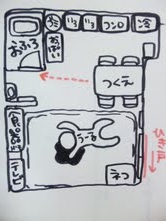 台所(さっきのイラストでいうとおっぱいの右らへん)にいる母に何か質問をしにきたようですが、部屋に入ってまず目に飛び込んできたのが妖怪半裸猫背(うーる)だったせいか一瞬固まる。